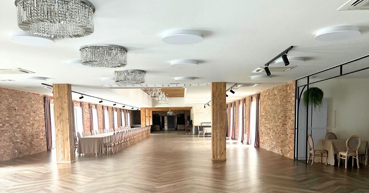 Elegancka sala z parkietem 130 m² - jednym z największych w okolicach Warszawy. Klimatyzacja strefowa, mobilne ściany akustyczne, oświetlenie architektoniczne.